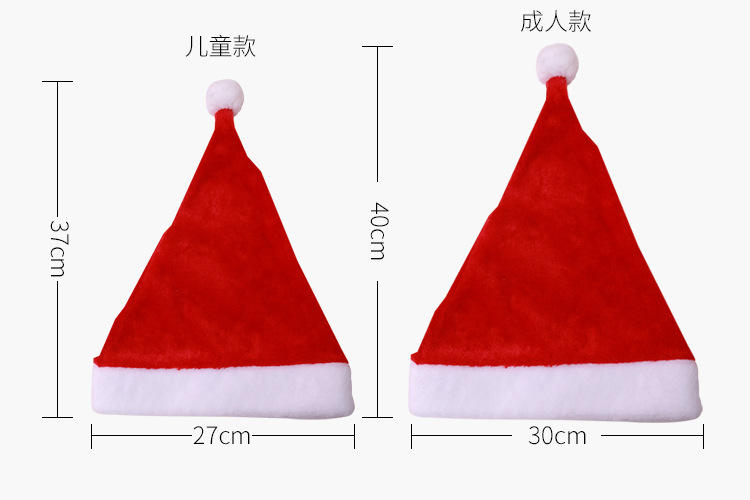 material:Plush;Size:Adult:30*40cm, kids:27*37cm;Packaging:opp bag;MOQ:24pcs;Quality:100% full inspection of Christmas Plush Hat;Package size per batch:31X20X3 cm;Gross weight per batch:0.061 kg